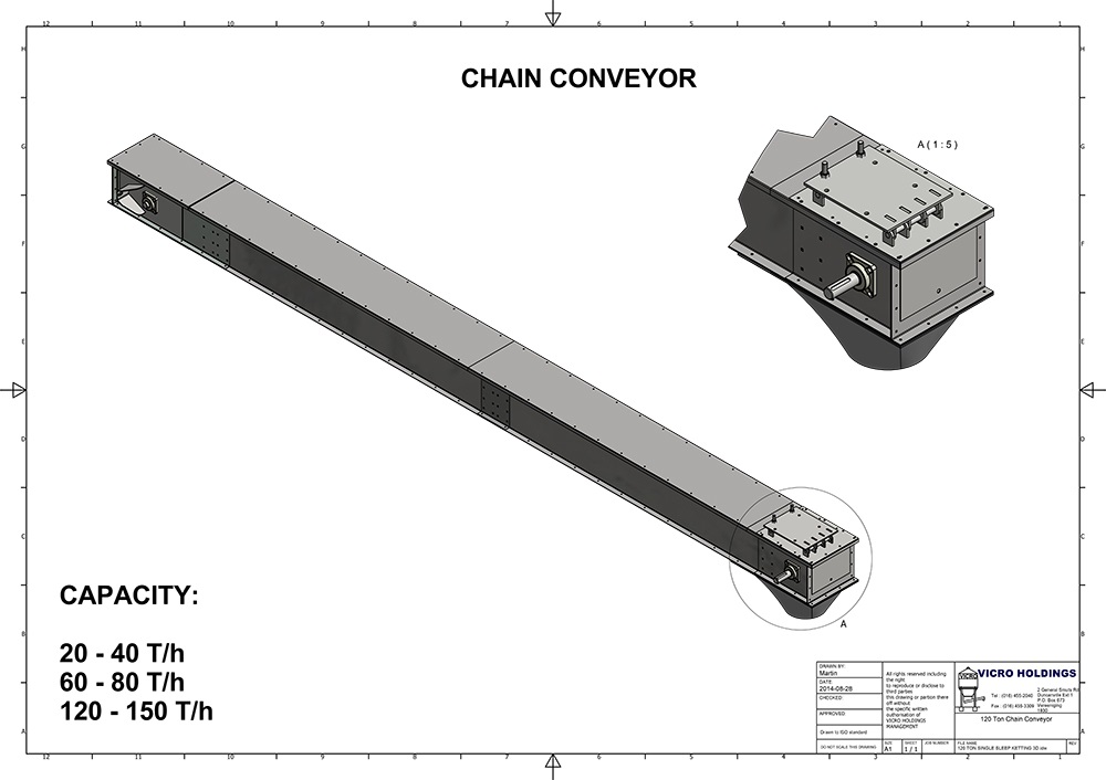 7500 LBS Scraper Chain Capacities available - 20 T/hr to 120 T/hr Drive - SEW Gearbox Tandem systems used when length exceeds 30 meters OPTIONAL Hand operated sluice with assebly points for pneumatic cylinders